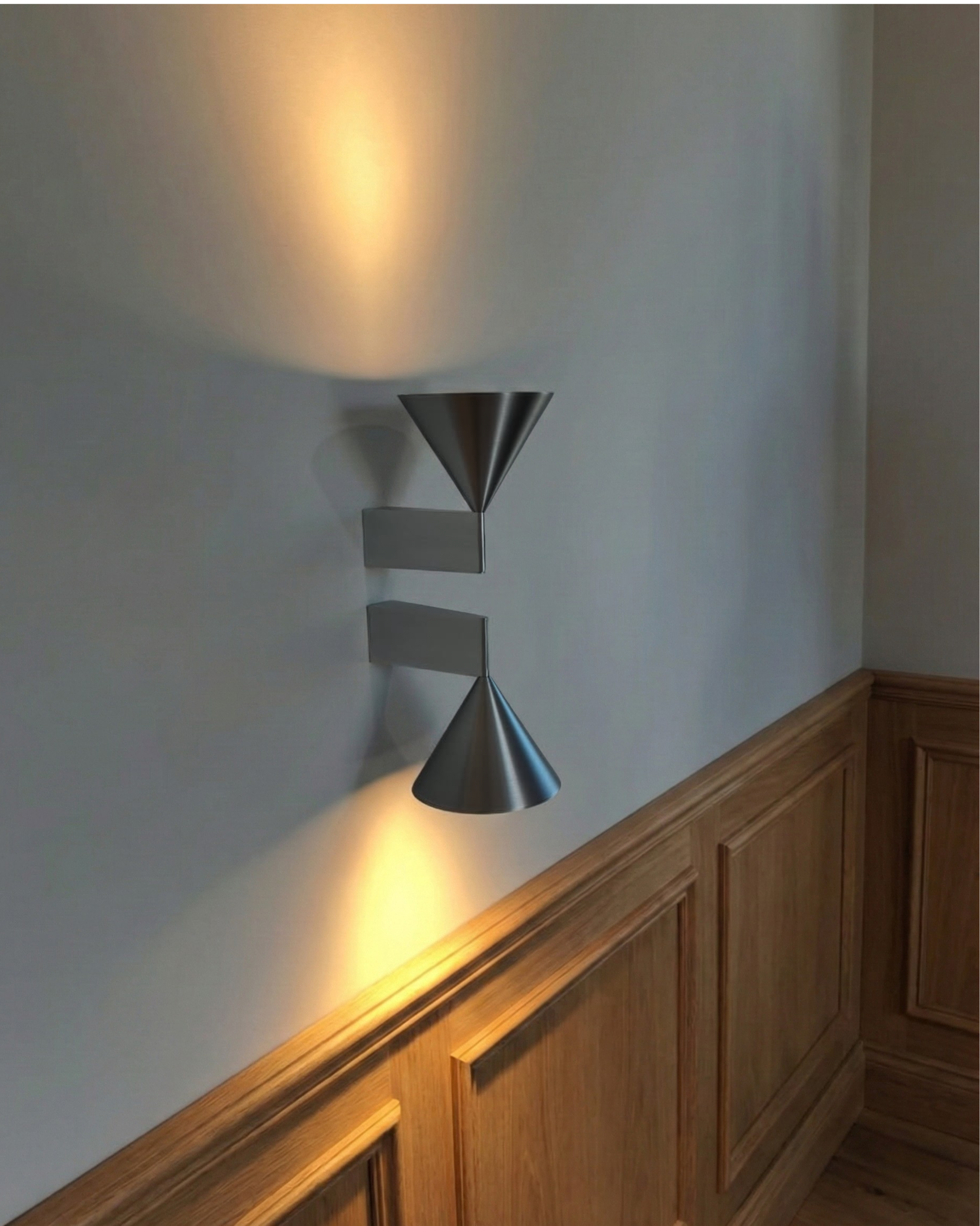 Architecture de la lumière KROMA se distingue par sa silhouette conique audacieuse, fusion parfaite entre l'inspiration industrielle et le minimalisme contemporain. Sa finition en aluminium brossé de haute précision capture l'essence du design intemporel, transformant chaque mur en une galerie d'art moderne.