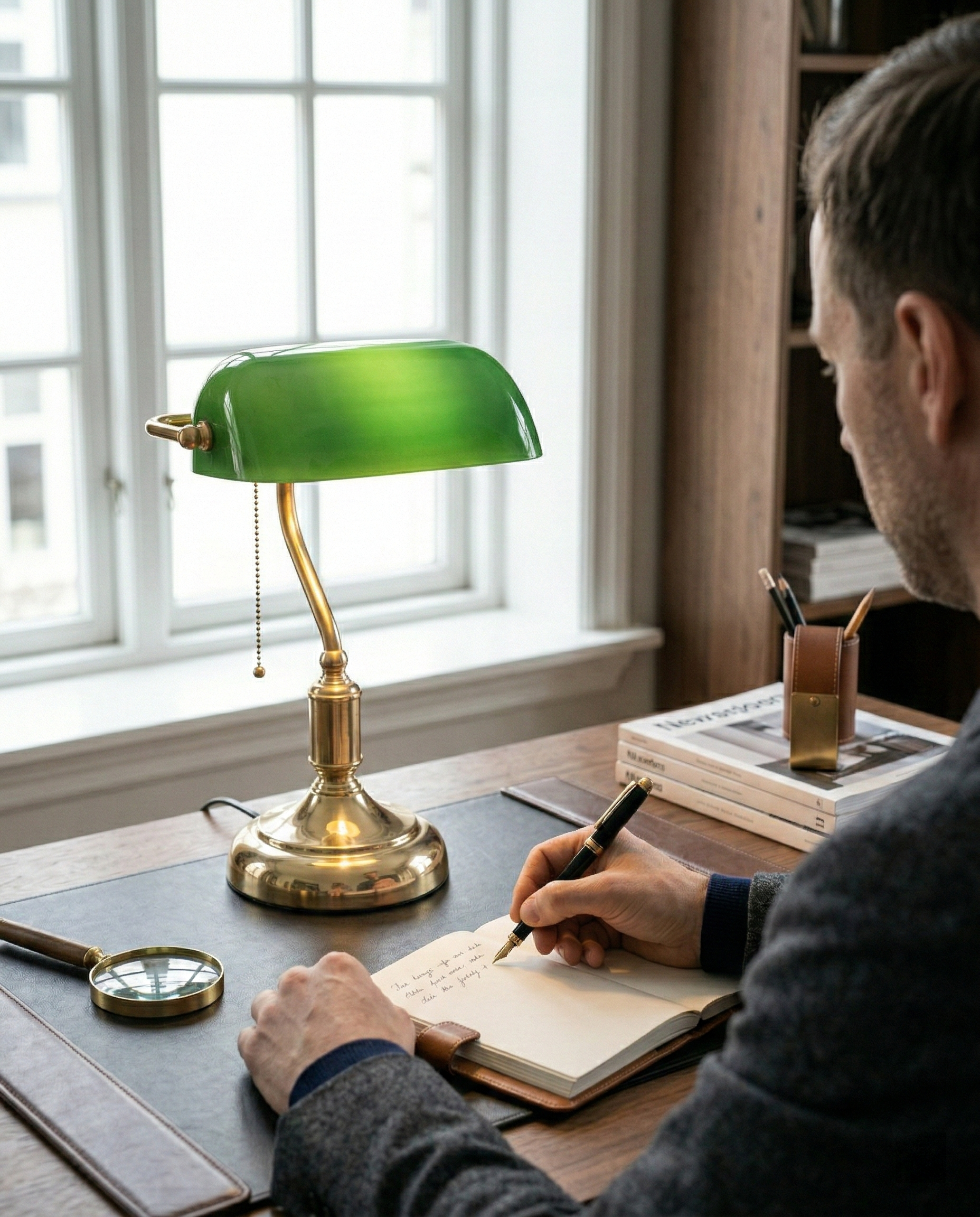 La Sérénité Émeraude La véritable magie d'Antik réside dans son emblématique abat-jour en verre vert. Conçue historiquement pour soulager la fatigue visuelle des comptables, la lueur émeraude filtre la lumière pour diffuser un halo chaud, feutré et incroyablement apaisant. C'est l'outil parfait pour instaurer un sanctuaire de concentration et de calme profond sur votre bureau.